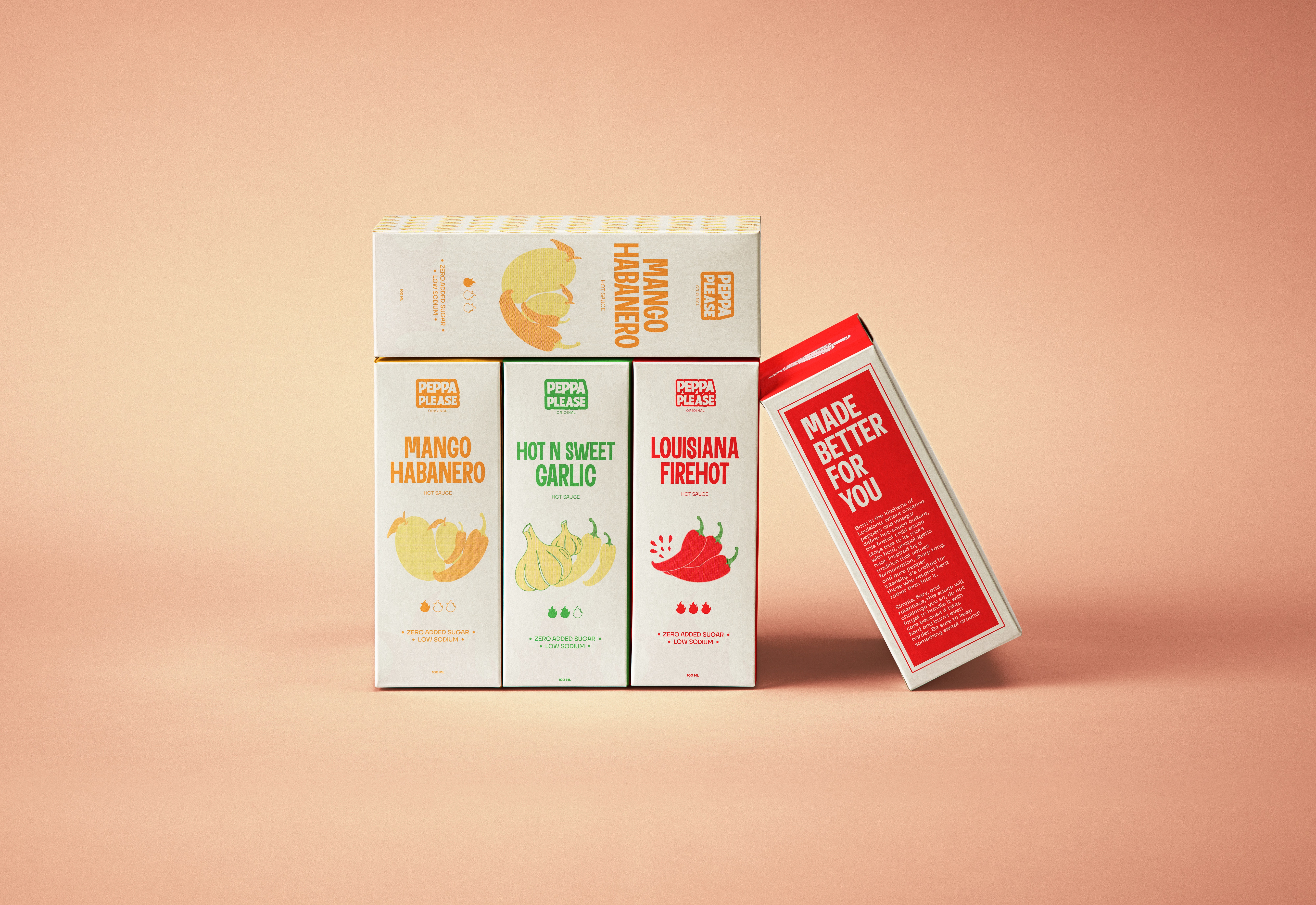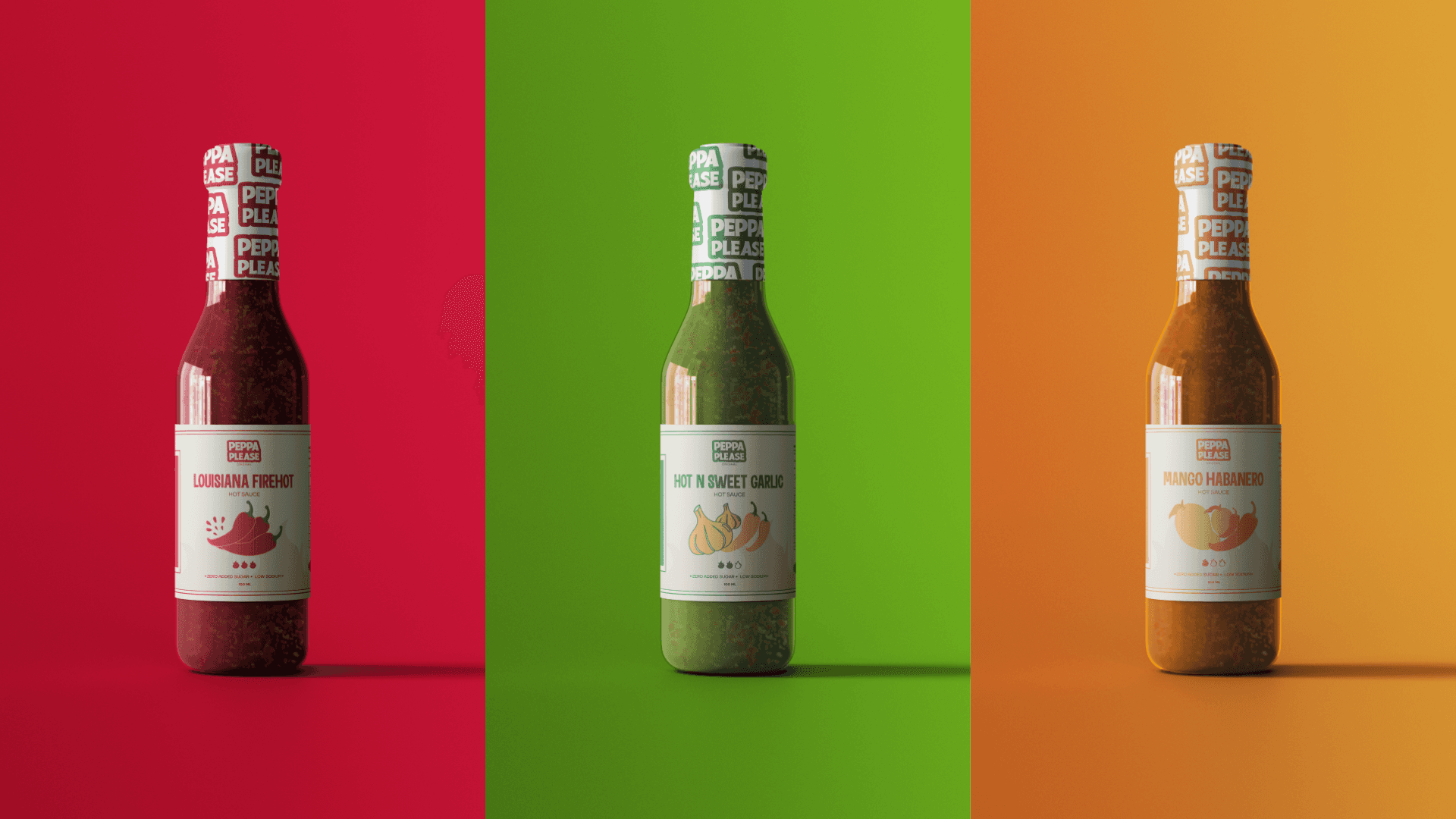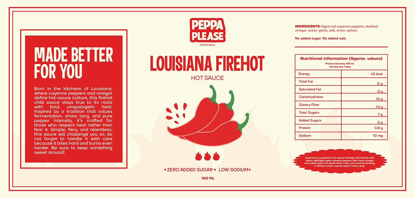 Peppa Please is a fun, bold hot sauce brand made for people aged 16-35 who enjoy flavour as much as heat. The branding focuses on strong typography, bright colours, and playful food-inspired visuals.